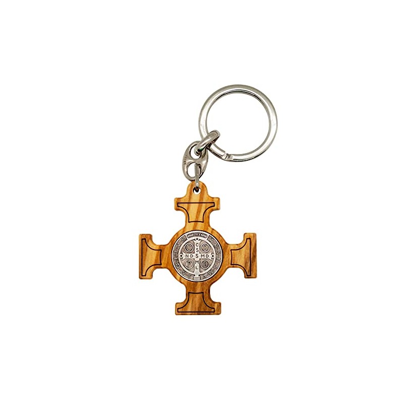 - This beautiful keychain is made of wood and has a metal St. Benedict medal imbedded in the center.