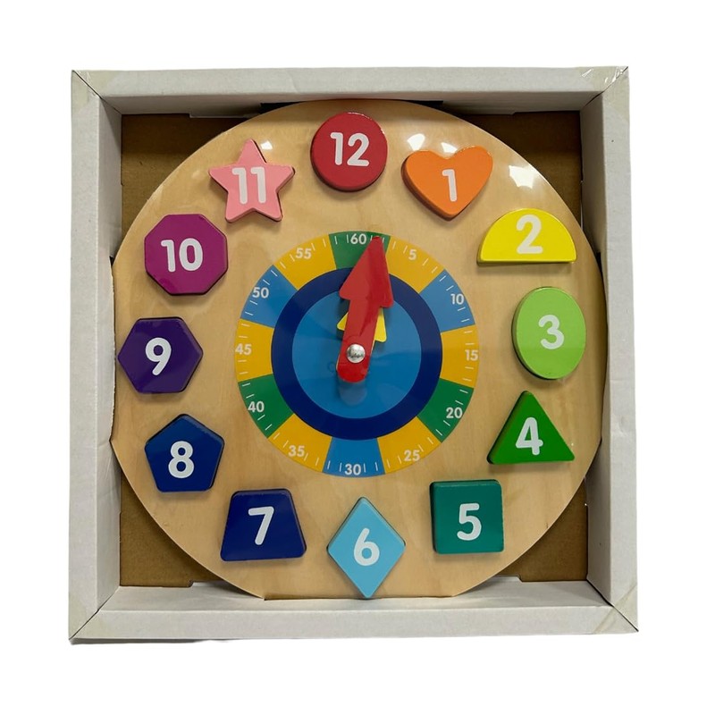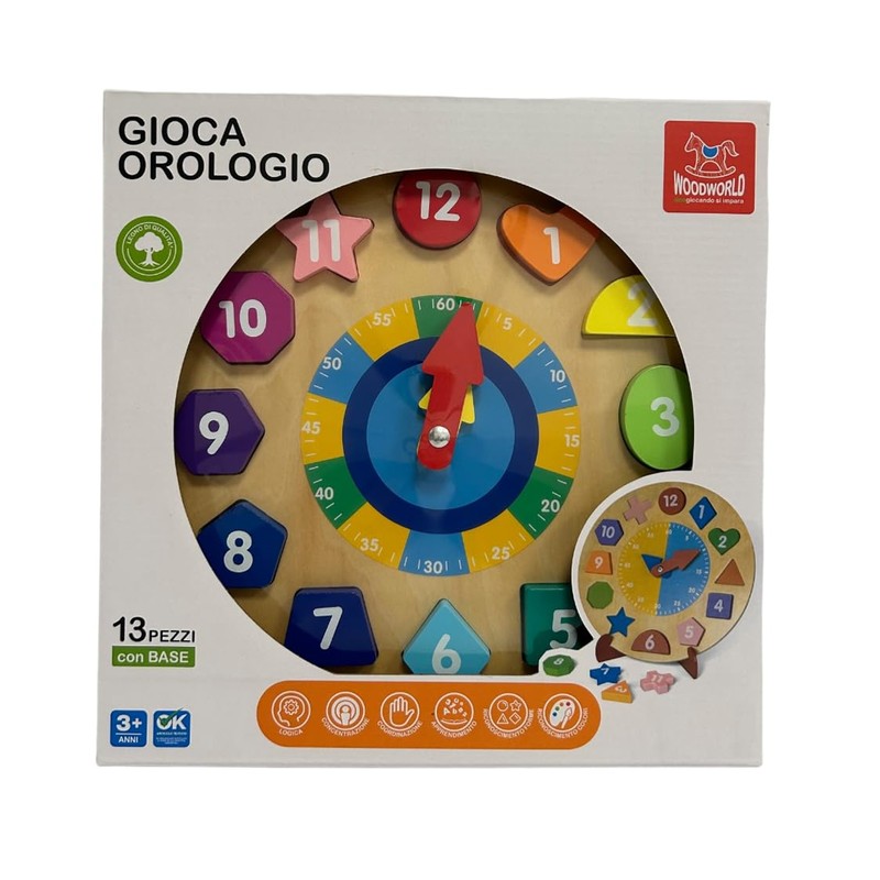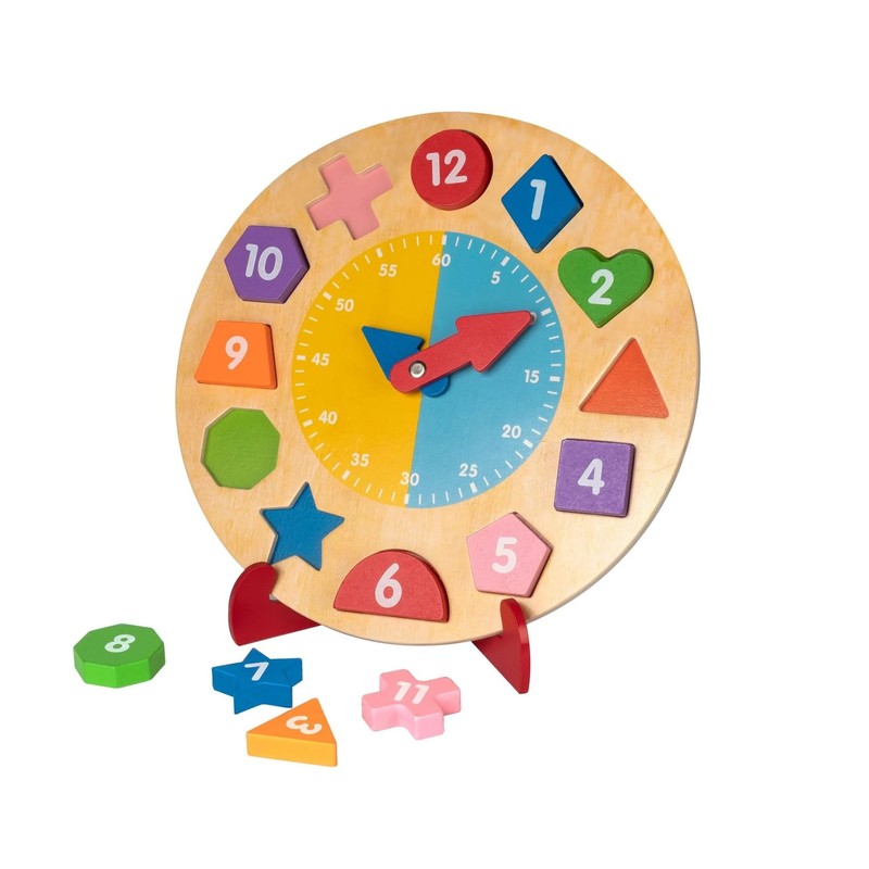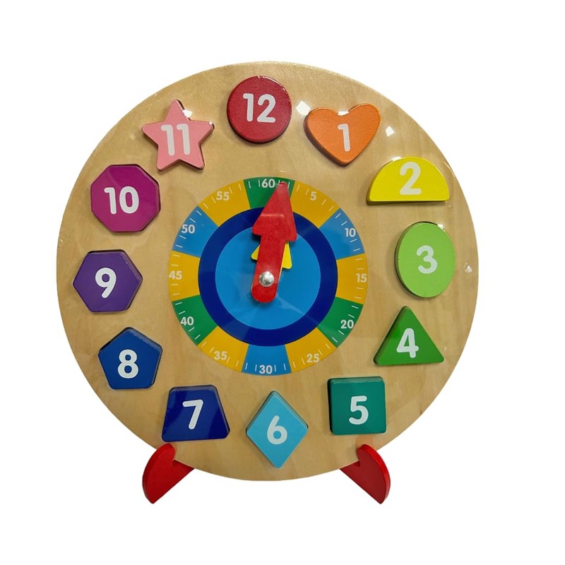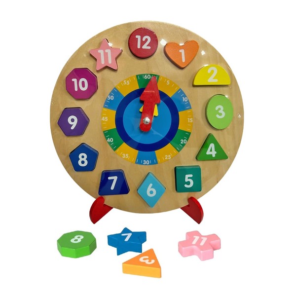 • With 13 pieces included and a sturdy watch holder to keep them upright (12 pieces shapes and 1 wooden base), this watch is designed to engage children in educational activities that develop logic, concentration and coordination. Learning features: logic - concentration - coordination - learning - colour and shape recognition