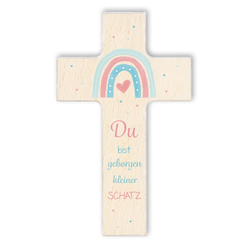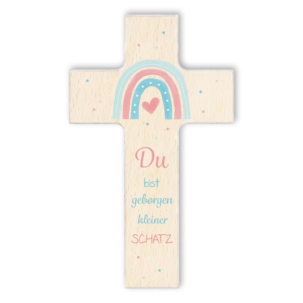 Wooden Cross "Du bist geborgen kleiner Schatz" | Heart Under the Rainbow | Christian Gift for Children Natural, 15 cm