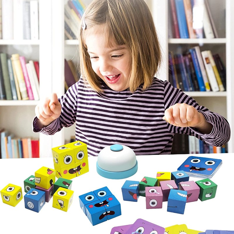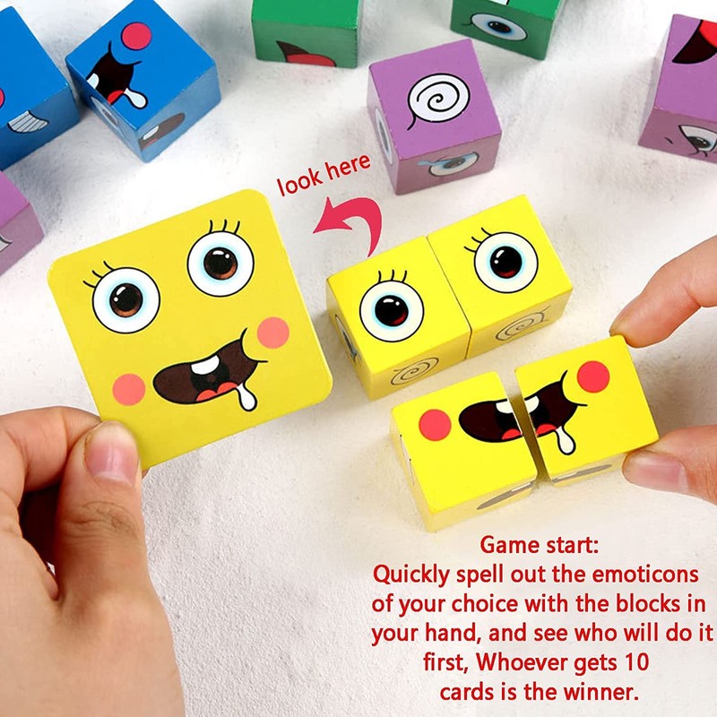 - Good social game: this expression puzzle building blocks toy set comes with wooden blocks with expression and sophisticated face cards, small and portable. Children can play with their family members as well as their classmates. This wooden cube puzzle game encourages children's interpersonal skills and deepens friendships between children.