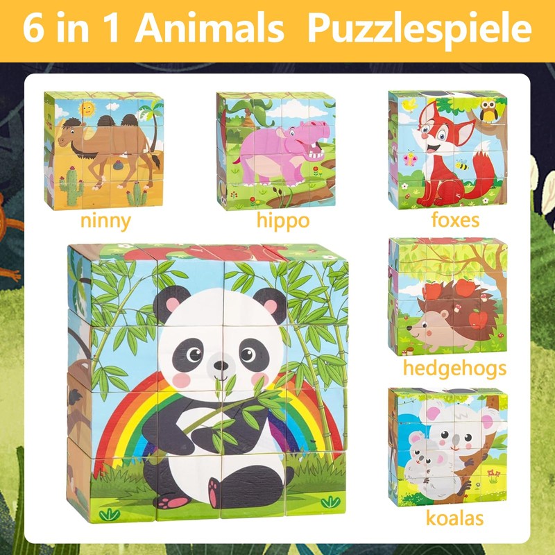 - Educational toy from 3 4 5 years: each side of the cube has a different pattern. The cute animals not only help your child recognize different animals, but these wooden puzzles also improve your child's concentration and ability to solve puzzles. The learning game promotes logical thinking, hand-eye coordination, colour matching, memory and concentration of your child.