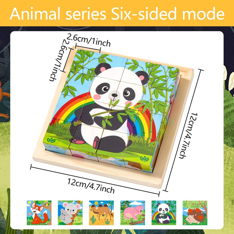 - 6-in-1 wooden cube puzzle: wooden toy is an easy to play 6-in-1 puzzle. 16 cubes can make the 6 cheerful animal motifs - panda, koala, hippo, fox, hedgehog and camel. As well as a durable wooden palette to store all puzzles for easy storage.