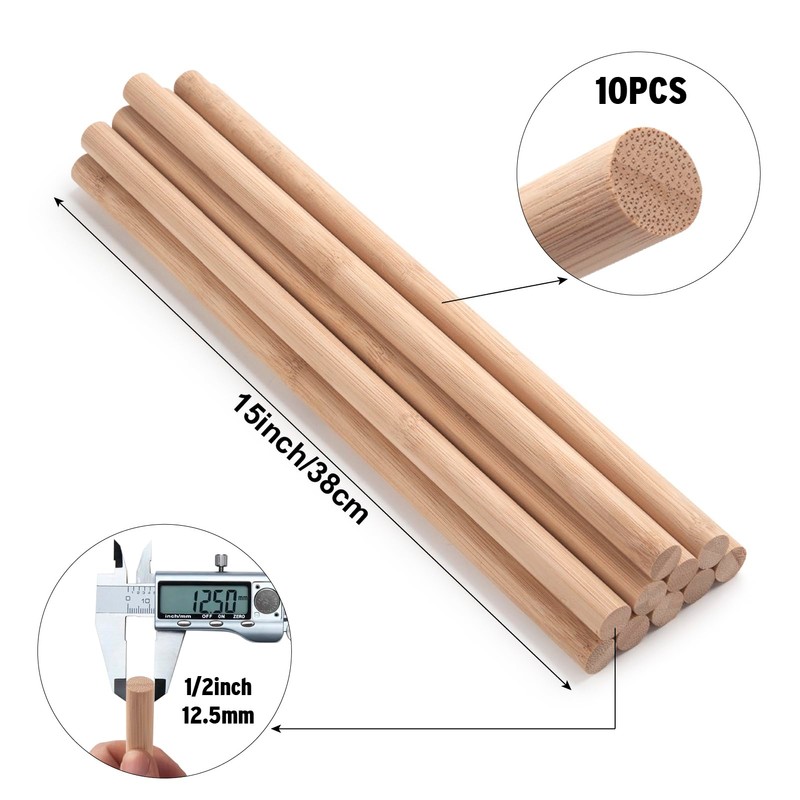 Wooden Dowel Rods Wood Dowels for Crafting, 10PCS 1/2 x 15 Natural Round Bamboo Craft Sticks Macrame Dowel, Unfinished Hardwood Sticks for Crafts, Wedding Ribbon Wands, Arts and DIYers