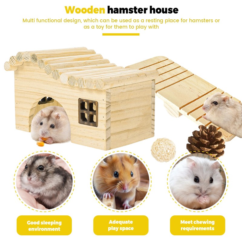 Wooden Hamster Platform and Dwarf Hamster House, Cute Syrian Tiny House Hideout, Small Animal Pet DIY Accessories for Rats, Gerbils & Small Pets (All-in-one)