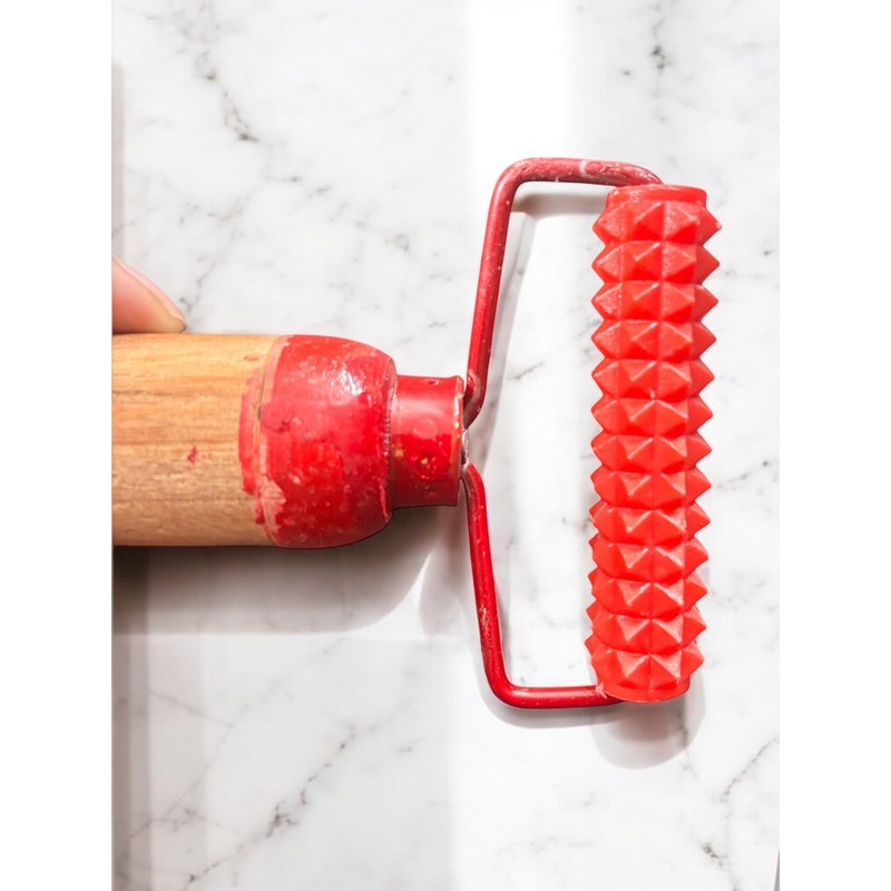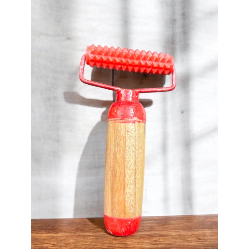 - VERSATILE DESIGN: Wooden massage roller with textured red grip handle and acupressure rolling surface for full-body massage and stress relief