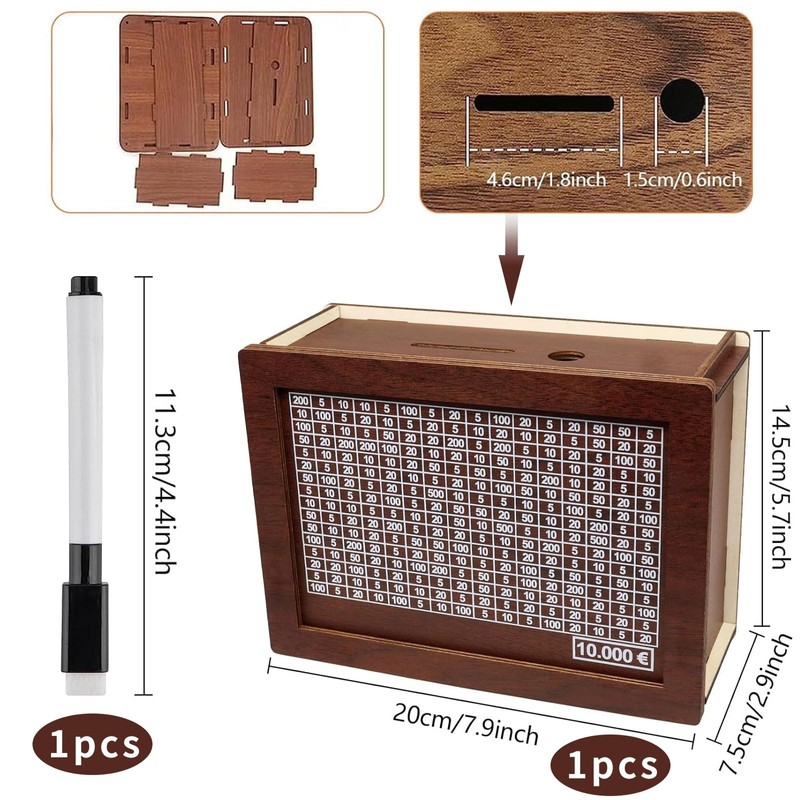 - Wooden money box: When buying this wooden money box, you will receive 1 wooden piggy bank and 1 marker that helps you store change and cash. Teach your children the value of saving and experience how saving is more fun!