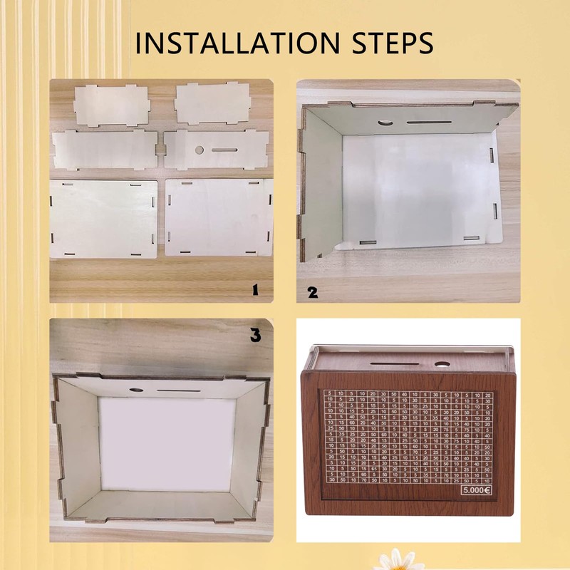 - Easy installation and use: To avoid damage, the wood money box is sent disassembled and assembly is easy without tools (with assembly instructions). Comes with an erasable, water-soluble pen for easy reuse.