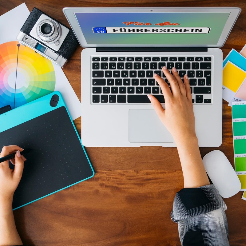 - The money box has the motif on the front. On a green-blue background is the saying 'Für den Fahrerschein' (For the driving licence). The word driving licence is highlighted by a number plate motif.