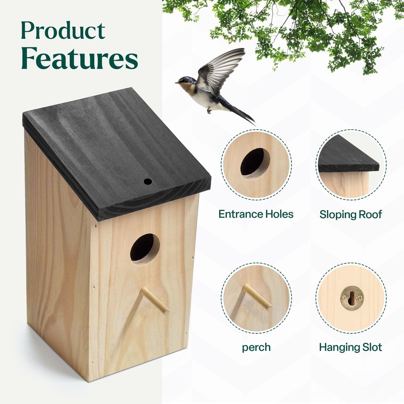 - Features: Weather resistant, sloping roof to allow for rain runoff and keep the bird house dry during wetter periods; As perches can encourage and facilitate larger birds to destroy nests and eggs, we have opted to leave them off our box