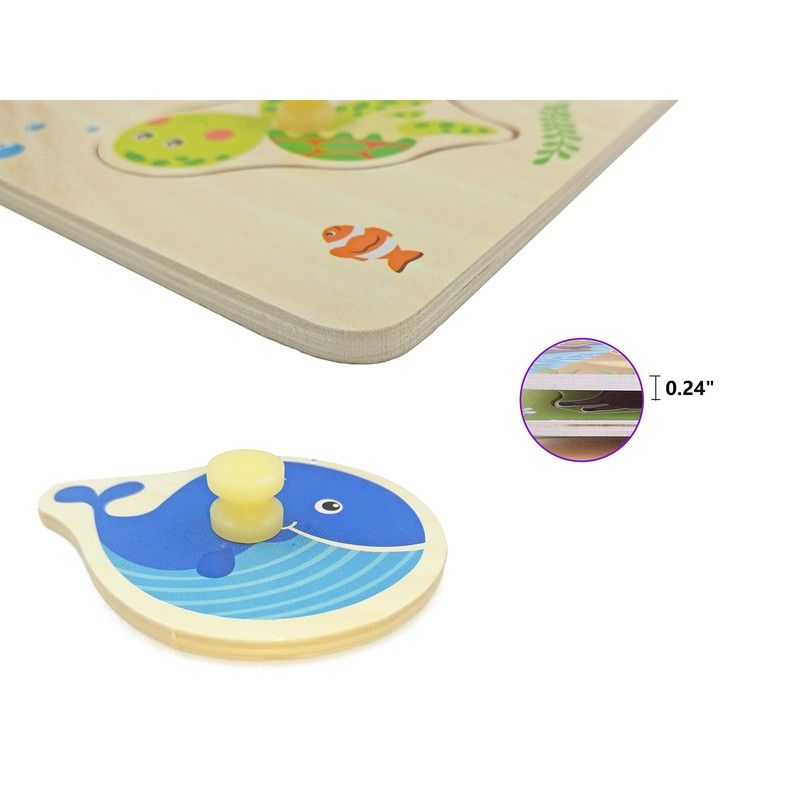 The sea creature featured on this extra-thick wooden puzzle is designed as eleven easy-to-grasp parts, chunky puzzle pieces that have a full-color matching pictures underneath. Recognize and match correct picture or start pretend play as well, encouraging hand-eye coordination, fine motor skills and visual clues.