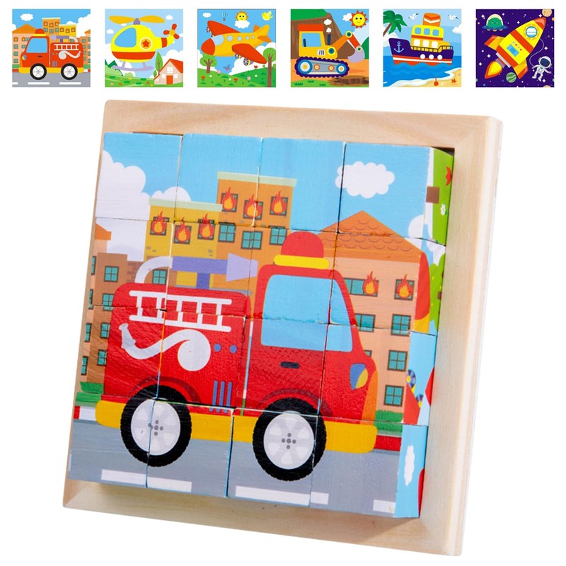 Wooden Picture Cube, 3D Cube Puzzle, Puzzle Games, 6-in-1 Transport Motifs with 16 Cubes, Wooden Puzzle Montessori Toy for Children from 1 2 3 4 Years