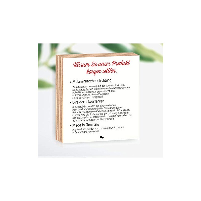 ✔️ Size 15 x 15 x 2 cm: a perfect size for standing or hanging. ✔️ Melamine resin coating: white wood coating on the front and back. No adhesive film like most competitor products. High resistance to moisture. Durable and scratch-resistant surface. Easy to clean and maintain. ✔️ Direct printing process: the wooden pictures are printed on a modern industrial printing machine in UV direct printing (no use of adhesive film that can peel off). The paint is applied to the coating and cured at the same time. This makes the image look even more elegant and creates a tactile perception.
