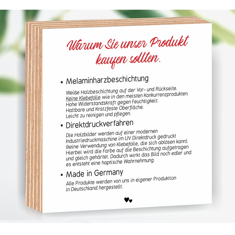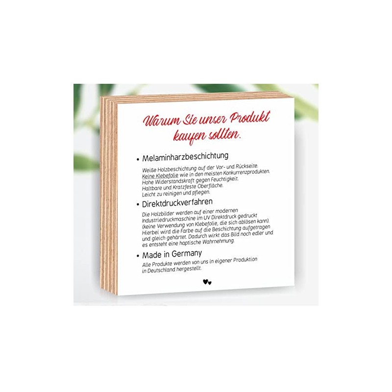 ✔️ Size 15 x 15 x 2 cm: a perfect size for standing or hanging. ✔️ Melamine resin coating: white wood coating on the front and back. No adhesive film like most competitor products. High resistance to moisture. Durable and scratch-resistant surface. Easy to clean and maintain. ✔️ Direct printing process: the wooden pictures are printed on a modern industrial printing machine in UV direct printing (no use of adhesive film that can peel off). The paint is applied to the coating and cured at the same time. This makes the image look even more elegant and creates a tactile perception.