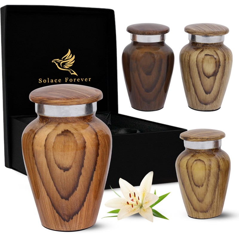 Wooden Print Keepsake Urns - Small Cremation Urns - Mini Urns for Human Ashes Set of 4 with Premium Box & Bags - Honor Your Loved One with Metallic Wooden Urns for Ashes - Small Urns for Men & Women