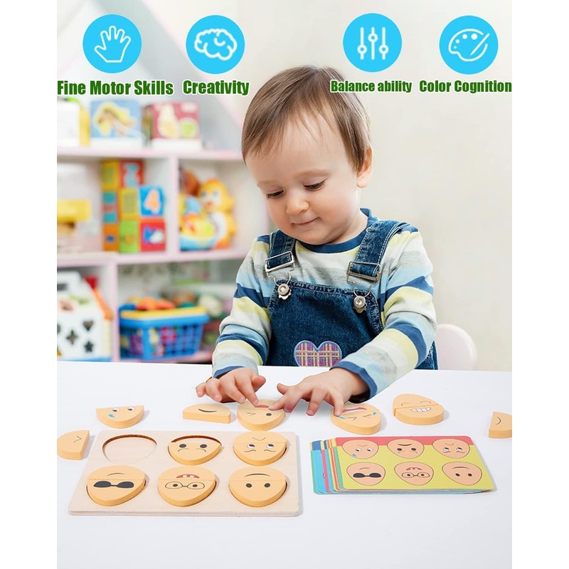 - Wooden puzzle set: contains 23 pieces with 10 different facial expression patterns. There are different expressions on the front and back, and 12 expression cards.