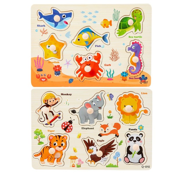 Wooden Puzzle, Pack of 2 Wooden Toys from Montessori Toy for Children, Wooden Toy Consisting of Puzzles with Animal, with Handle, for Boys and Girls, Animals, Sea Creatures, Multicoloured