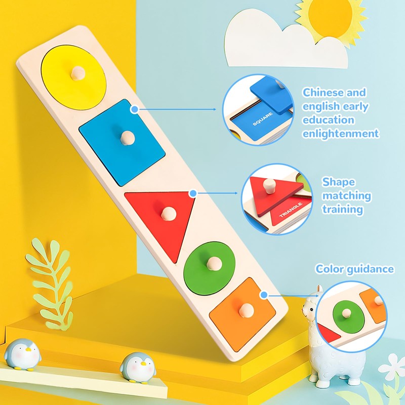 - đăEarly Education Enlightenment ToysăPreschool wooden puzzles are a perfect early educational toy that allows children to develop the brain and active thinking. Shape matching toy allows children to put different sizes of wooden blocks into the corresponding matching board, and children can recognize different shapes. Different colors of baby wooden toys attract children's interest