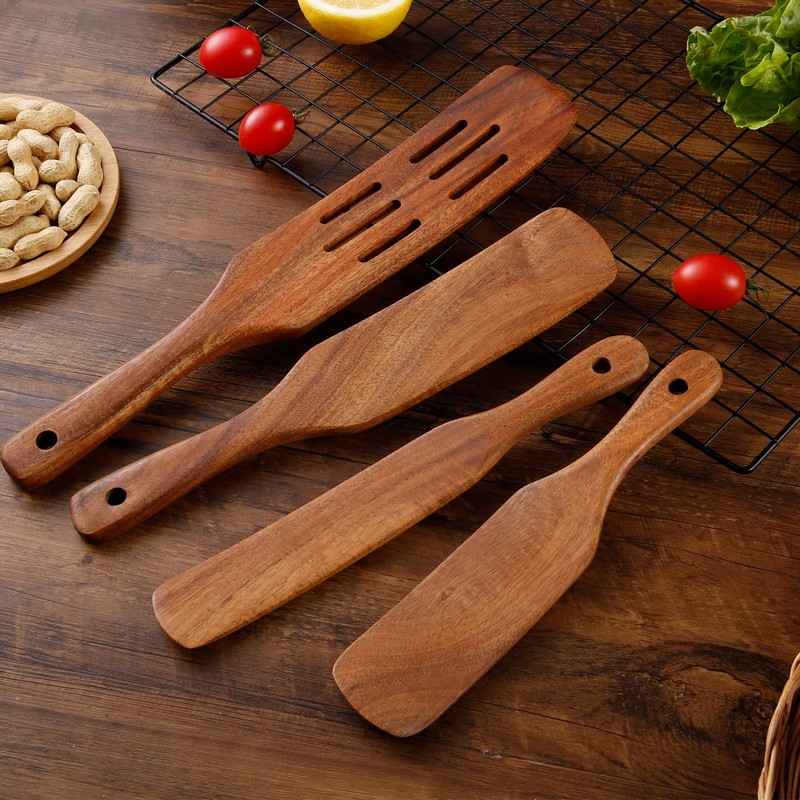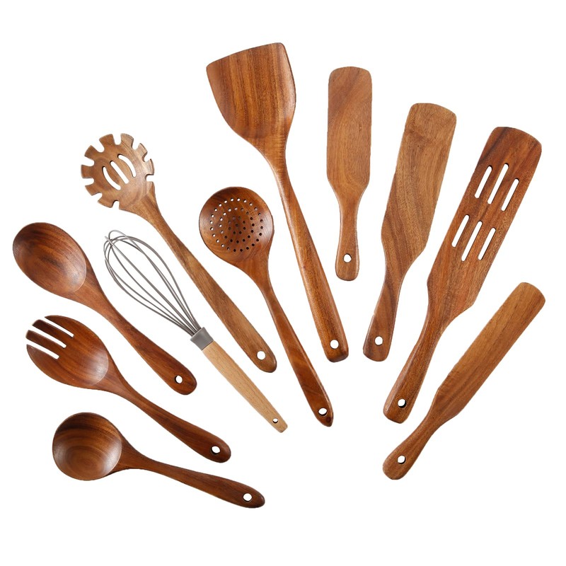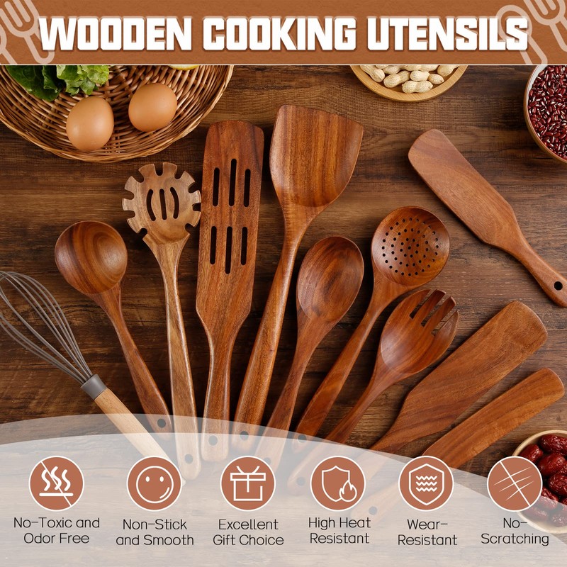 - 【100% Natural Teak Wood】Utensil set for cooking is made of 100% high-quality teak wood. No chemical substances, non-toxic, no peculiar smell for safe use. This wood material is hard, not easy to deform and crack. Long-term use that is still bright as new. It's loved by the majority of cooking enthusiasts.