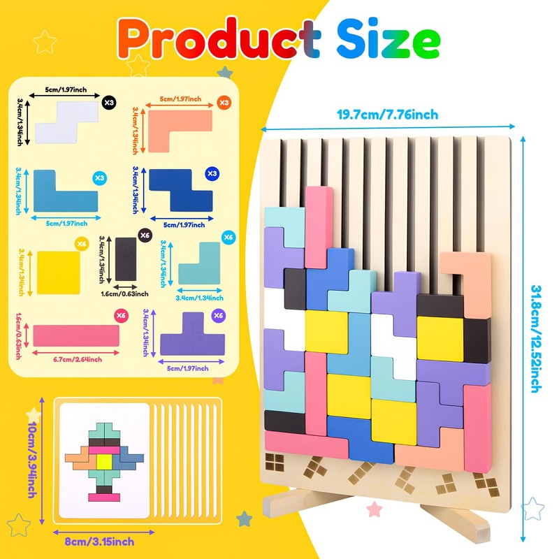 - 【Inspiring Imagination】Russian blocks use common geometric patterns and colors to provide rich game options. This wooden stacking toy has a wealth of shapes and elements to choose from. Every time you put the puzzle pieces together, the graphics will be different, and you can find different ways to play.