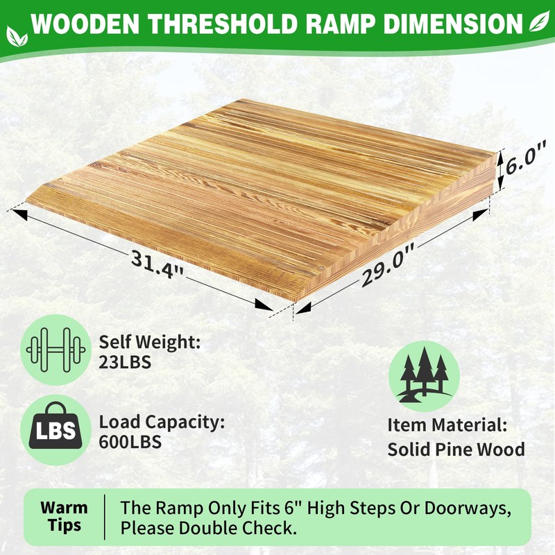 - [Sturdy & Reliable Wooden Threshold Ramp]: Crafted from solid pine wood with a 25mm thickness, our threshold ramp can support up to 600LBS, ensuring a safe and secure transition for wheelchairs, walkers, carts, and scooters. Warm Tips: This ramp is designed for 6" high steps or doorways.