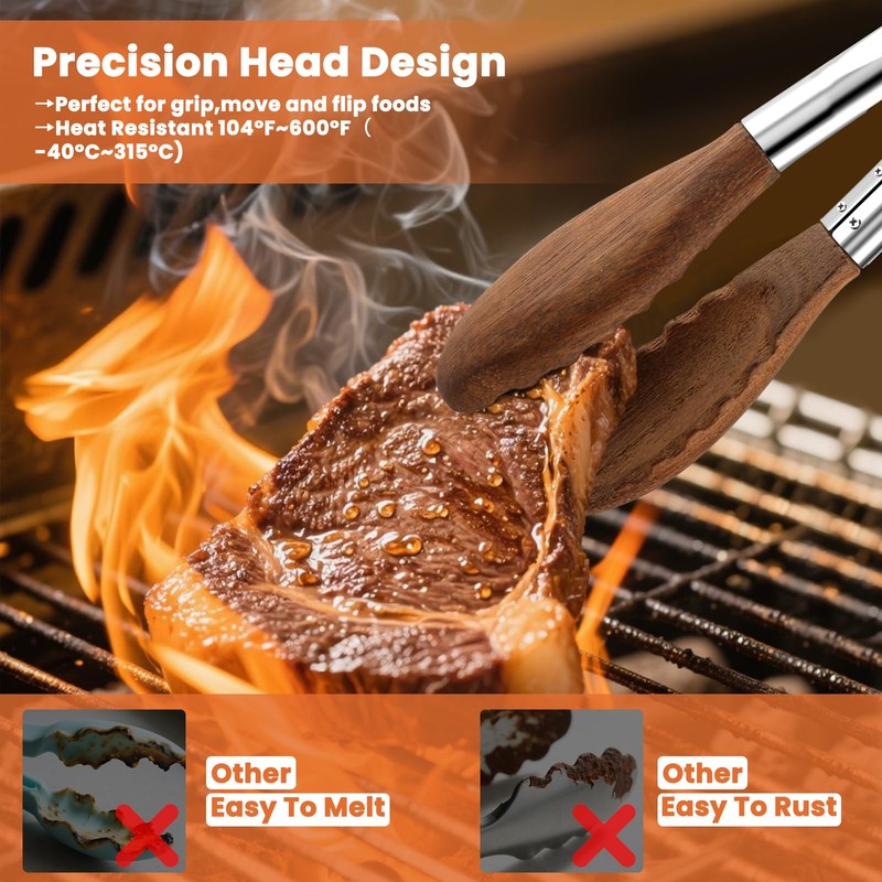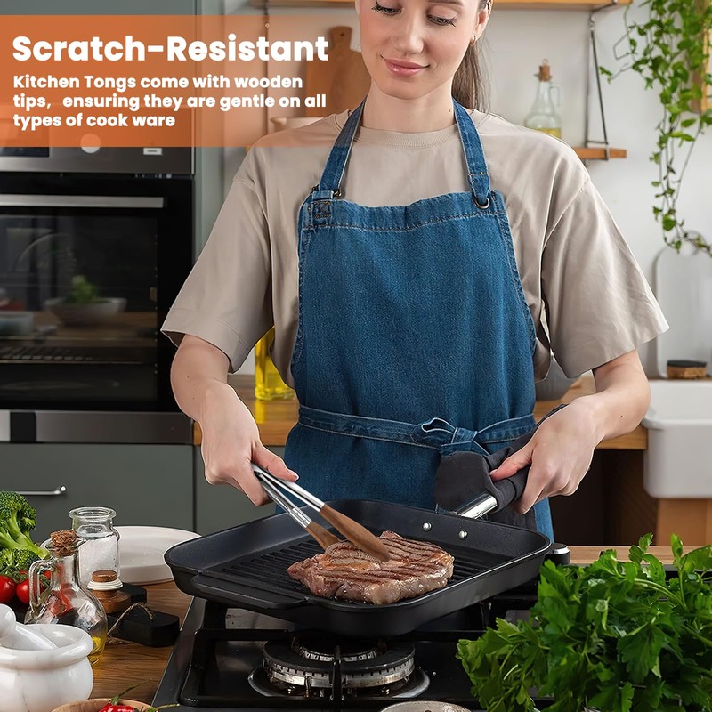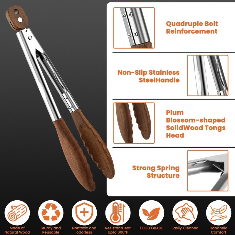 - 【 Natural Walnut Wood & Stainless Steel Build 】 Crafted from food-safe, natural walnut wood and reinforced with sturdy stainless steel, these tongs offer a durable and reliable alternative to plastic or silicone utensils. The wooden tips are guaranteed to protect your non-stick cookware from scratches