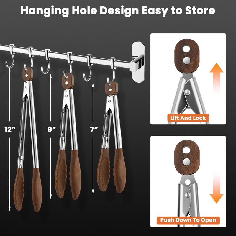 - 【 Convenient Pull-Lock for Storage 】 Features a simple yet effective pull-ring locking mechanism to keep the tongs securely closed when not in use. This design makes them compact for easy drawer storage or allows you to hang them neatly on a hook, saving valuable kitchen space