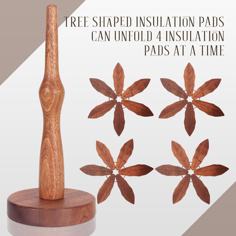 - 【Tree Shape Trivet Set】Trivets For Hot Dishes Is Made Of Wood And Consists Of 4 Pieces Of Trivet + 1 Bracket,With Good Thermal Insulation, It Can Withstand The Temperature Of Hot Food,Which Can Protect The Countertop And Tabletop From Damage,It Has An Automatic Folding Mechanism For Flexible Use. Just Push It Lightly And It Can Be Easily Unfolded, Adding A Touch Of Fun To Your Kitchen Routine.