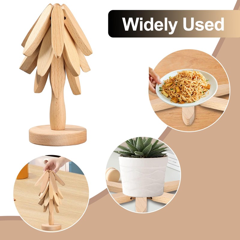 - Tree-Shaped Design & Functionality: The wooden trivet set features a tree-shaped design that is both decorative and functional. It includes 3 trivets + a stand, making it a unique piece of kitchen decor that can also serve as storage for the trivets.