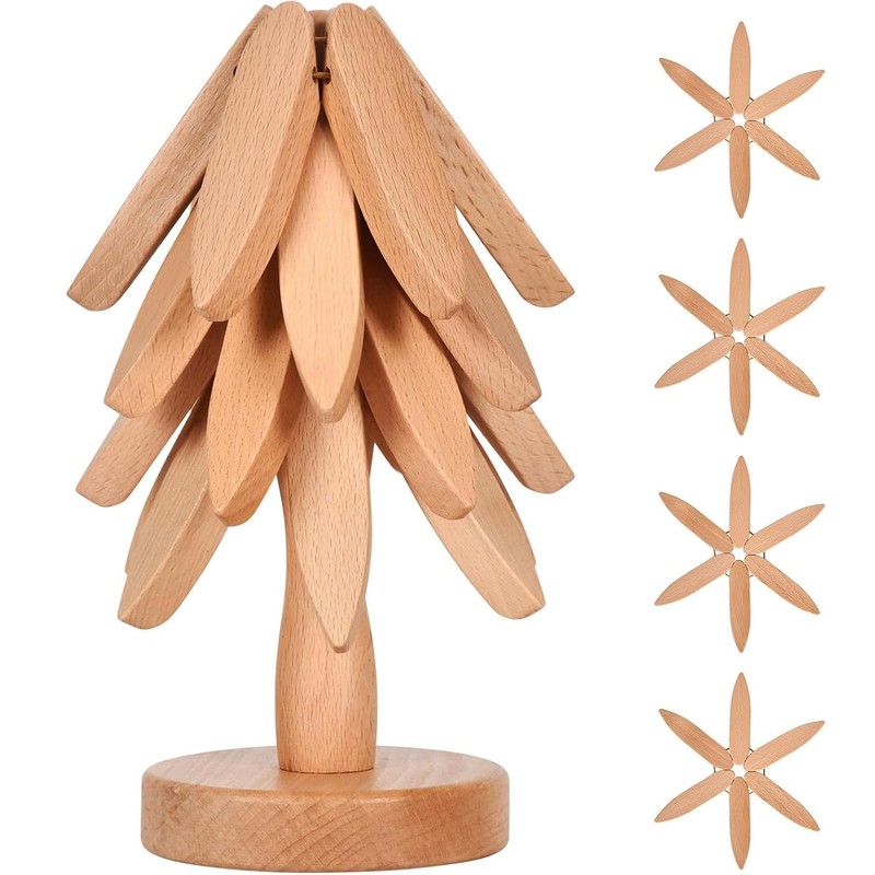 Wooden Trivets for Hot Dishes, Tree Shape Trivets Set, 4 Wooden Trivets + 1 Stand Stored Like a Christmas Tree, Beech Wood Trivets for Hot Pots, Pans, Bowl, teapot