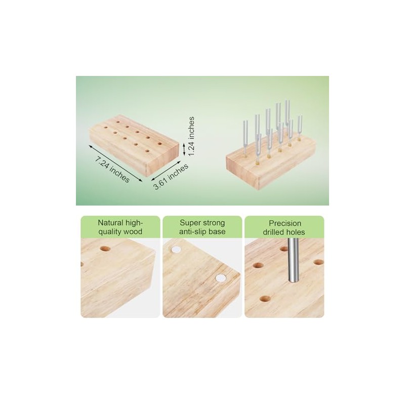 • Quality Craftsmanship: Crafted from premium natural wood, the holder is meticulously polished for a smooth finish that preserves the integrity of your tuning forks. Its portable design and anti-slip base ensure stability and ease of transport.