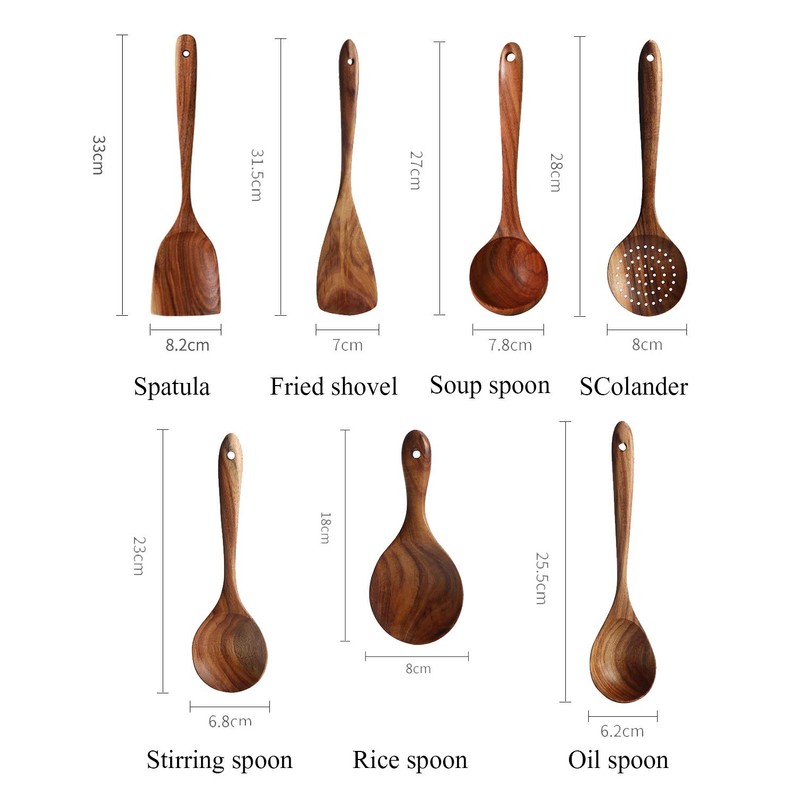 - ESSENTIAL KITCHEN TOOLS FOR HOME CHEFS - Set includes a stirring spoon, slotted spoon, flat spatula, rice scoop, wooden turner, serving spoon and oil spoon. Each handle features a hanging hole for easy storage. These wooden eating utensils won't scratch your pots & pans, don't worry about them melting like a silicone or plastic utensil. Messon cooking set covers all your kitchen needs from stirring to cooking