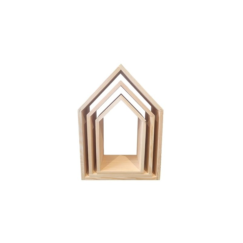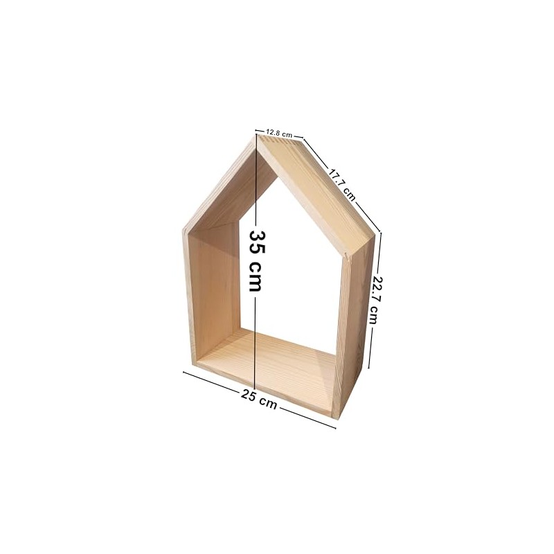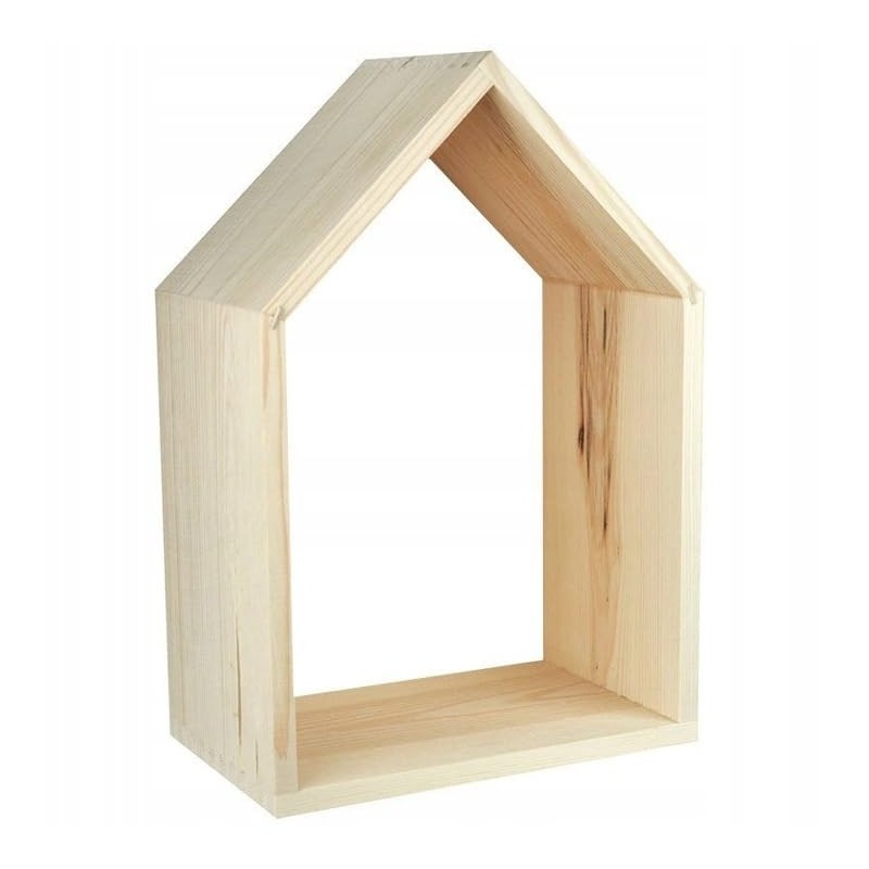 Wooden World - Wooden Shelf Plain Wall Hang Shape Of House Pine Wood - Large