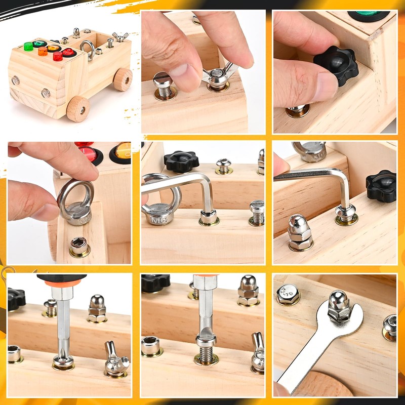 - WOOD SCREW BOARD FOR KIDS This screwdriver board is equipped with 10 different screws, 1 toy car, 2 keys, 4 wooden wheels and a variety of tools, including 1 small L-shaped Allen key, 1 large L-shaped Allen key, 1 open-end wrench, 1 small screwdriver and 1 large universal screwdriver. The two included screwdrivers are lightweight and feature a textured handle that ensures firm handling and makes it easier for children to operate them.