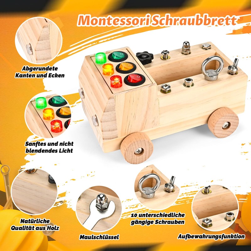 - NATURAL MATERIAL SENSORY TOY This screwdriver activity board is made of natural beech wood, which is durable and shiny. It features bright, colourful LED lights and has an attractive, sustainable design with smooth edges that are particularly suitable for children's little hands and allow safe and independent play. Please note that toddlers under 3 years old must always be closely monitored by an adult when using the toy.