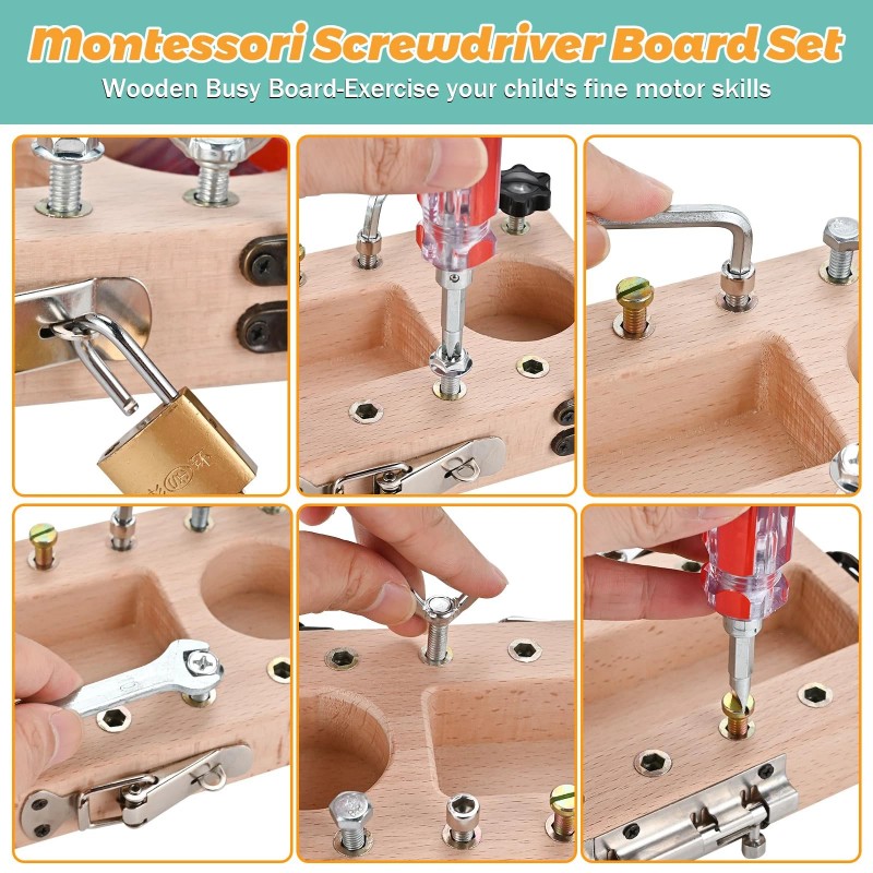 Montessori Tools for Toddlers: Our Montessori Screw driver Board Set includes 7 styles with 14 inserted screws, 1 toddler busy board, a wrench, a lock with 2 keys, a dual-purpose screwdriver, and an L-shaped hex wrench. These fine motor skills toys for 3 4 5 year old help your child exercise hands-on skills, develop fine motor skills, and enhance observational abilities
