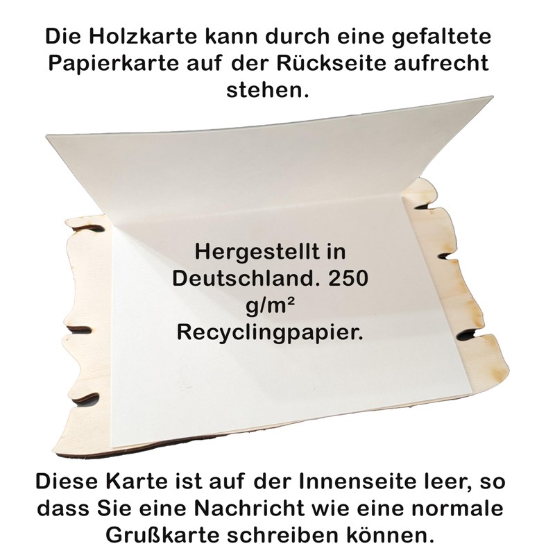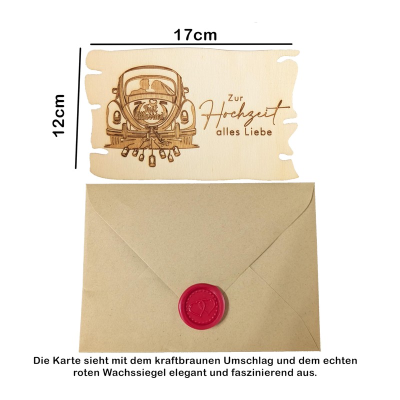 - Natural Elegance The delicate engraving of a car on the natural wood gives the card a touch of natural elegance, evoking the beauty of nature and setting the tone for a celebration with rustic charm or garden romance. The card is made from 3 mm thick poplar wood and is 17 cm wide and approx. 10.6 cm high.