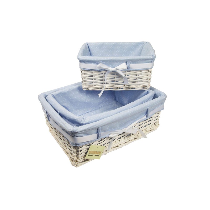 Woodluv Rectangular White Willow Wicker Hamper Storage Basket-With Blue Fabric & Ribbon (Gift Hamper Basket) -SMALL