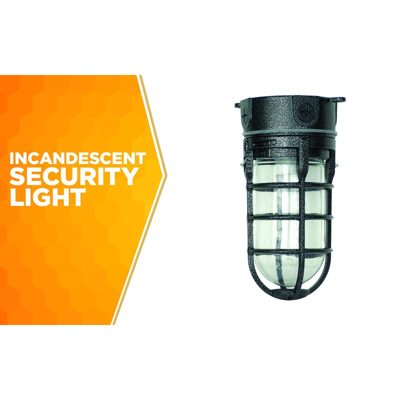 Woods L1706BLK compliment your home with the latest in decorative lighting. This versatile, easy to install attractive hammered black 150-watt ceiling mount incandescent light provides contemporary looking lighting and security to any business or home. Use this light where moisture is a concern. They are a great choice for your patio, garage, bathroom, pool and hot tub area, sauna area and more. This light uses (1) 150-watt incandescent bulb (not included). the light has an all metal die cast construction and a tempered glass lens enveloped by a vandal resistant safety guard. The light has 1/2-inch ips thread access on its top and sides and includes the mounting box. This item measures 9.5-Inches (h) by 4.5-Inches (w) by 4.5 -inches (d) and weighs 2.5-Pounds.