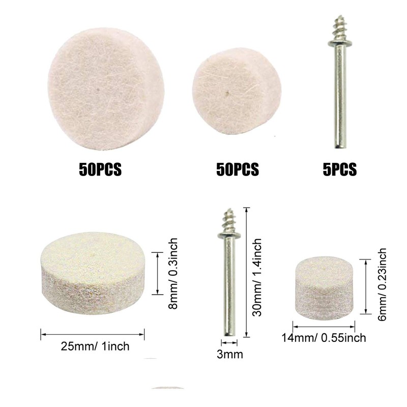 - Packaging includes: 145 PCS felt polishing buffing wheels in 5 style (as the picture shows), 5 PCS standard 1/8 inch mandrels and 1 plastic box.