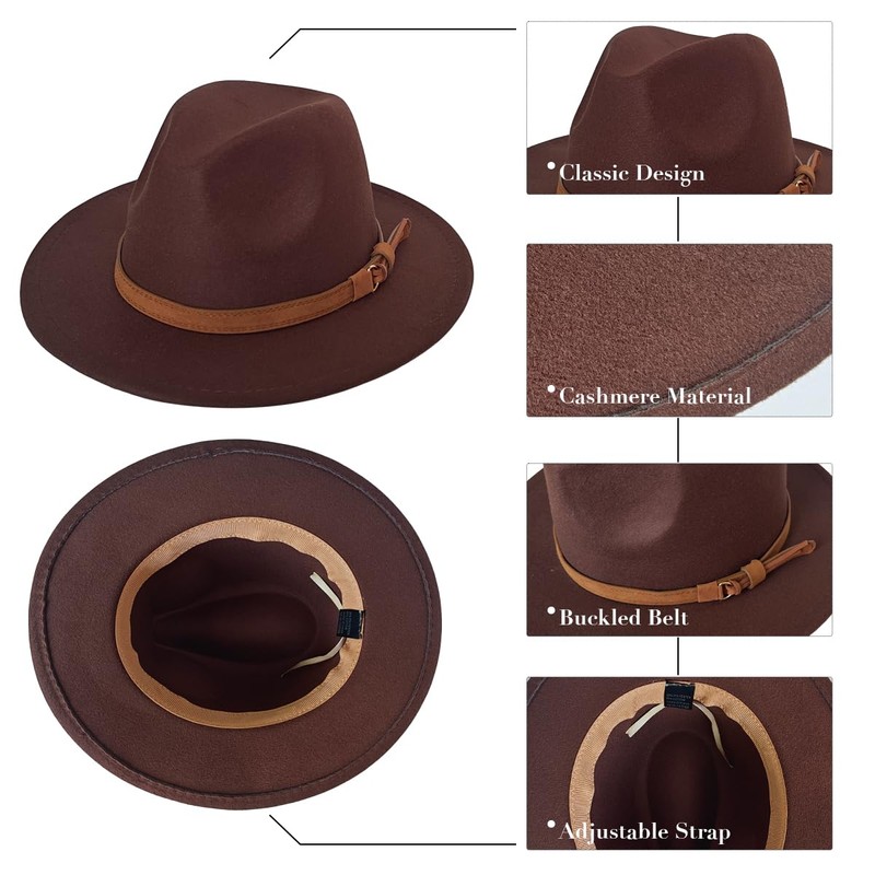 Wool Fedora Hat for Men Women, Wide Brim Felt Panama with Belt Buckle for Outdoor Beach Parties and Casual (UK, Numeric, 7, 7 1/4, Brown)