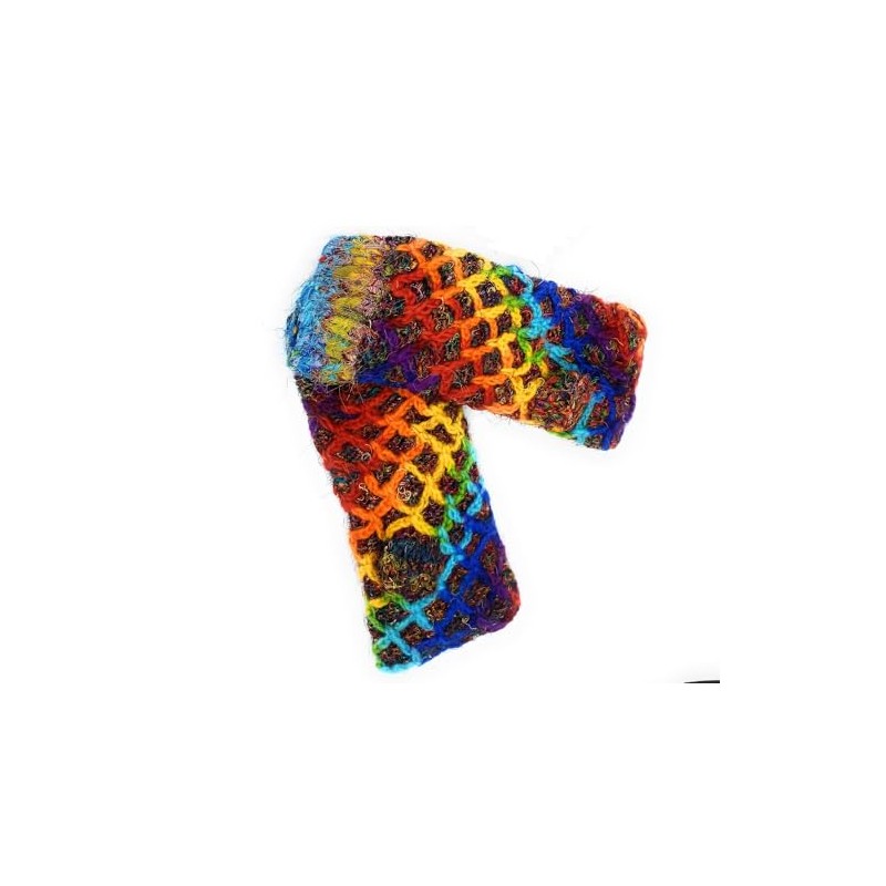 Wool & Silk Headband & Fingerless Gloves Set Diamond Chain Design Fleece Lined Hand Knit in Nepal (Rainbow Colors)