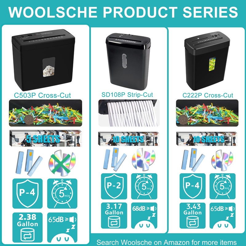 - Efficient and versatile:Woolsche Paper Shredder is designed for home office use, With its 5-sheet cross cut feature, making it the perfect tool for shredding paper, credit cards , you can shred Max 5 sheets documents at once needn't to remove any staples or clips.