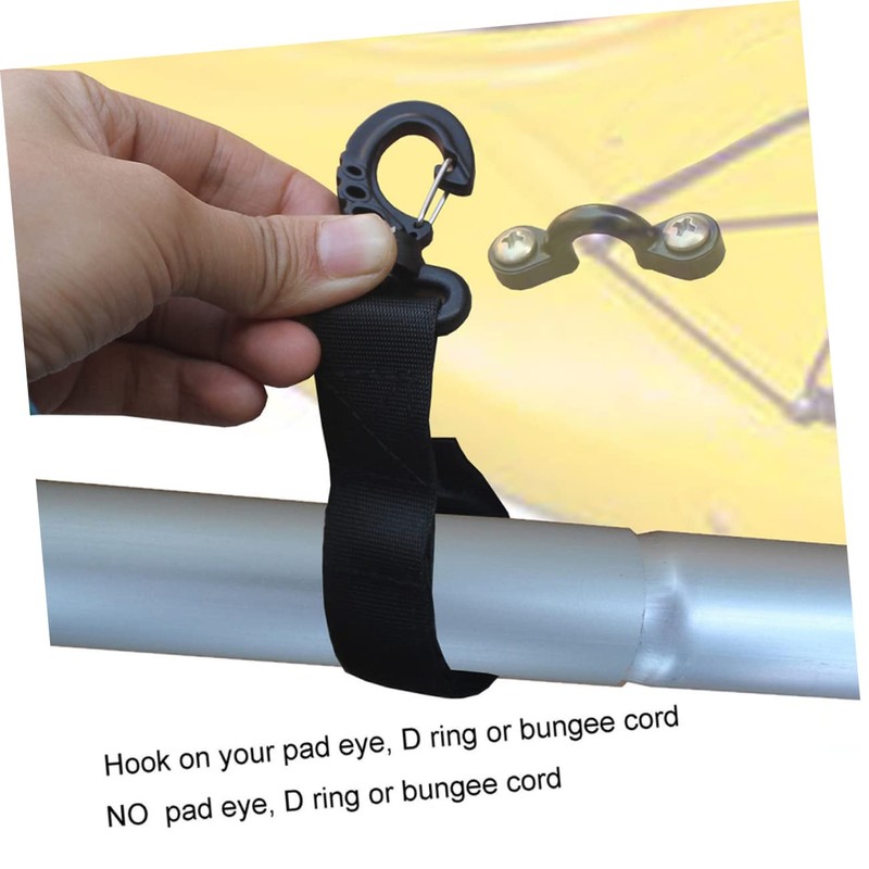 - Plastic hook-- can attach to any place, clips can the pad eye, d ring or any bungee cord.