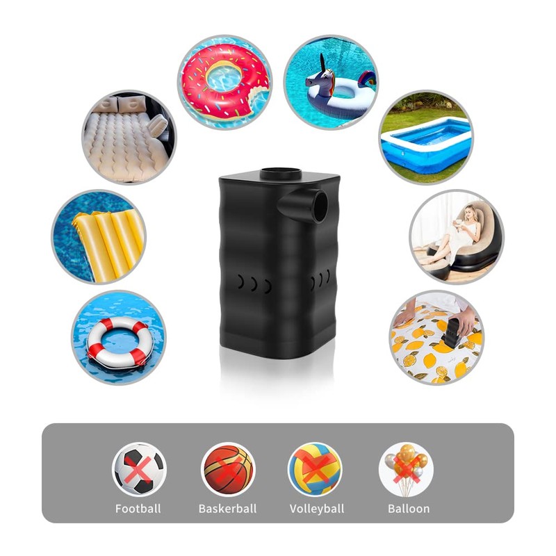 - Palm size body with inbuilt rechargeable battery makes one hand operation to inflate swimming rings, pool floats, air mattress at the beach possible