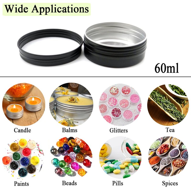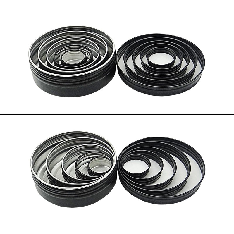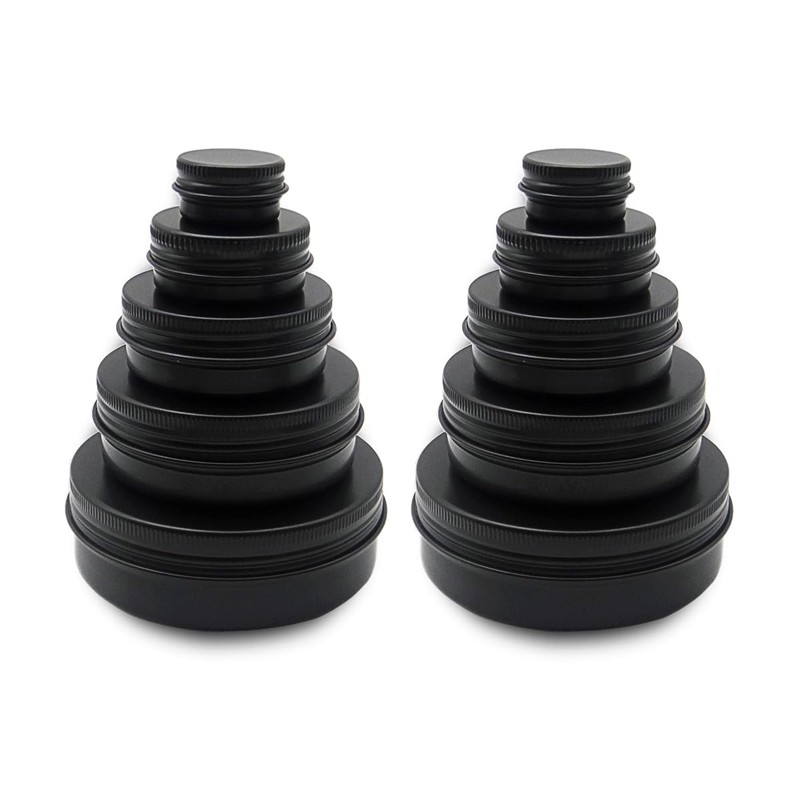 - Quality and size: includes 10 round black aluminum cans, 5ml, 15ml, 30ml, 60ml, 100ml, each size 2 packs, enough to store various small items for quick and convenient access