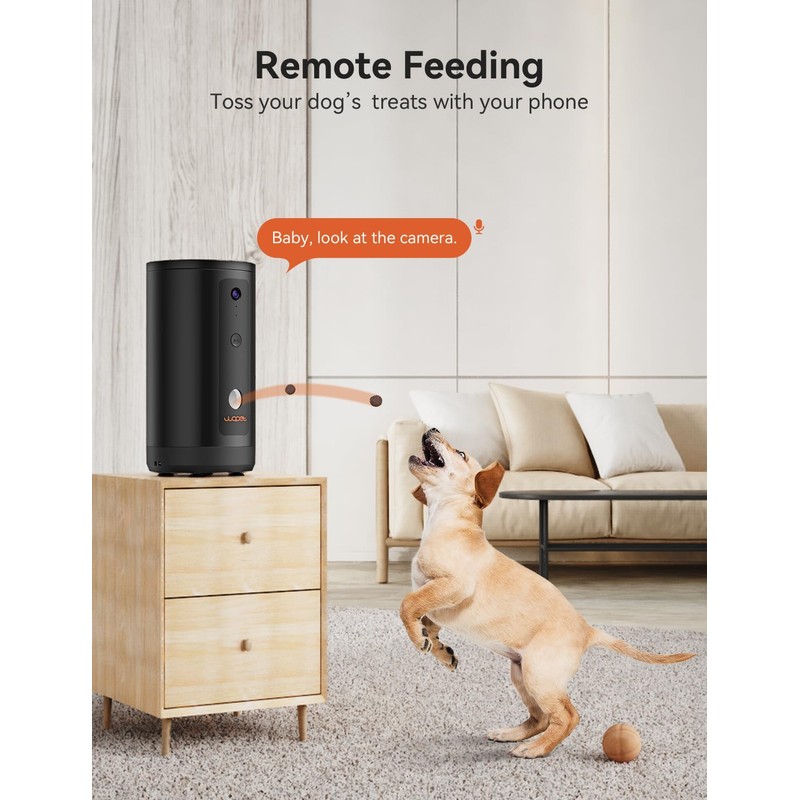 - Fun Treat Tossing: Toss your dog’s favorite treats with phone app, get their attention with the speaker, and play with them remotely through the treat tossing function. Let your dog experience your virtual presence even when you are not at home. Have them jump and chase treats and tell him he’s a good boy!