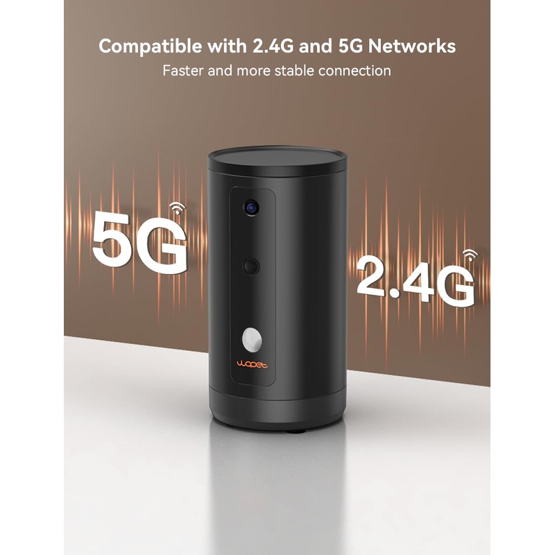 - Smart APP Control: WOPET Smart Pet Camera is compatible with both 5GHz and 2.4GHz WiFi systems, allowing you to program and monitor your pet's meals anywhere and anytime, to see, talk, play, and interact with your pet. Connect with your pet while you are away with the supported audio chat/recording. Sharing your favorite moment on social media directly if preferred.