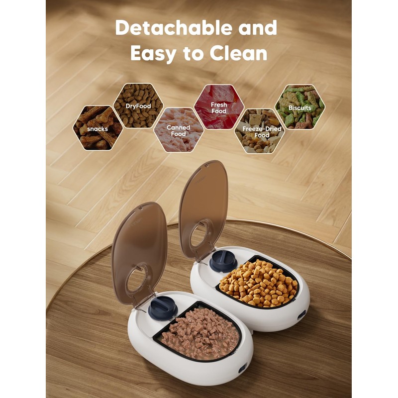 - Multi-Pet Compatibility: The WOPET automatic cat feeder works for dogs, cats, puppies, kittens, rabbits, and hamsters. Keep dry or wet food, treats, canned food, or even water fresh using the included ice pack placed under the food tray. Establish healthy eating habits effortlessly.