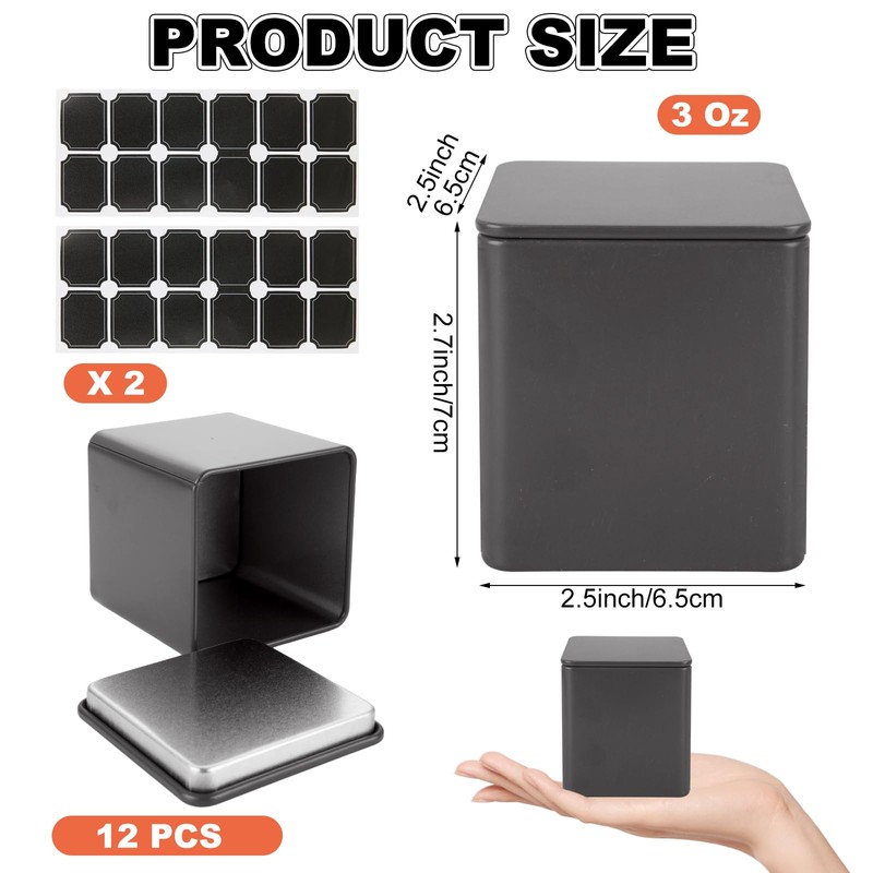 WOPPLXY 12 Pack Square Black Metal Tins, 6.5 Inch Small Tea Tin Canisters, 3 Oz Loose Leaf Tea Storage Containers with Airtight Lids, Square Tea Containers for Loose Tea, Herbs, Coffee, Cube Sugar