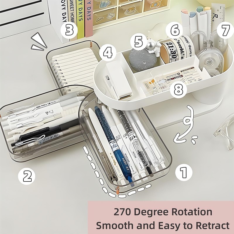 - 【Viel Speicher】Die Größe des multifunktionalen Desktop-Organisators ist 24.5*10.5*10 cm bis 9.6*4.1*4 Zoll. Der Schreibtisch-Stauraum besteht aus fünf Fächern und 3 drehbaren Schubladen, mit ausreichend Stauraum für alle Büroutensilien wie Taschenrechner, Klebeband, Radiergummi, Lineale, Stifte, Schere usw. Lassen Sie sich von dem chaotischen Schreibtisch verabschieden und bequem arbeiten.